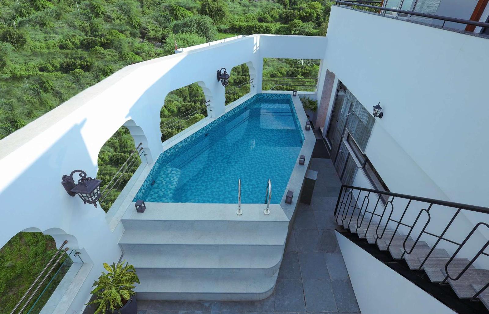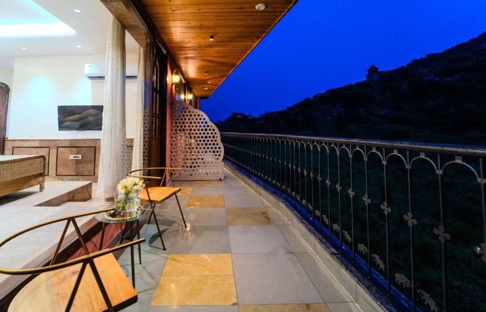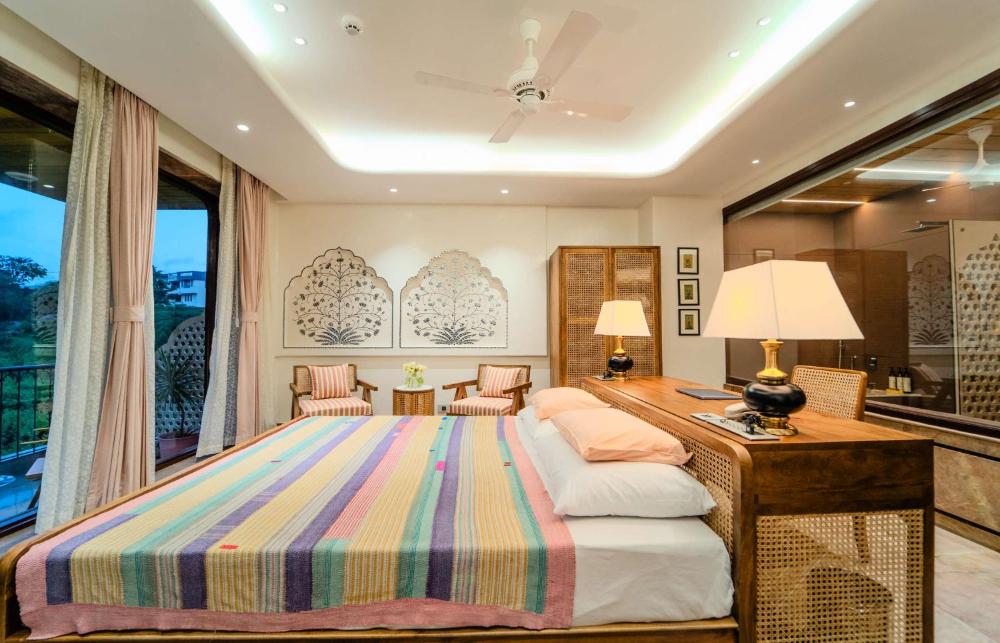 Görüntüler, yumuşak aydınlatma ve Aravalli dağlarının panoramik manzaralarıyla birlikte huzurlu çatı havuzunu ortaya koyuyor ve akşamüstüne rüya gibi bir kalite katıyor. Misafir odaları, olduğu gibi—aydınlık, ferah ve ölçülü bir tasarımla gösteriliyor. Bazıları yeşil avloları gözetlerken, diğerleri sabah güneşini yakalayan balkonlara açılıyor.